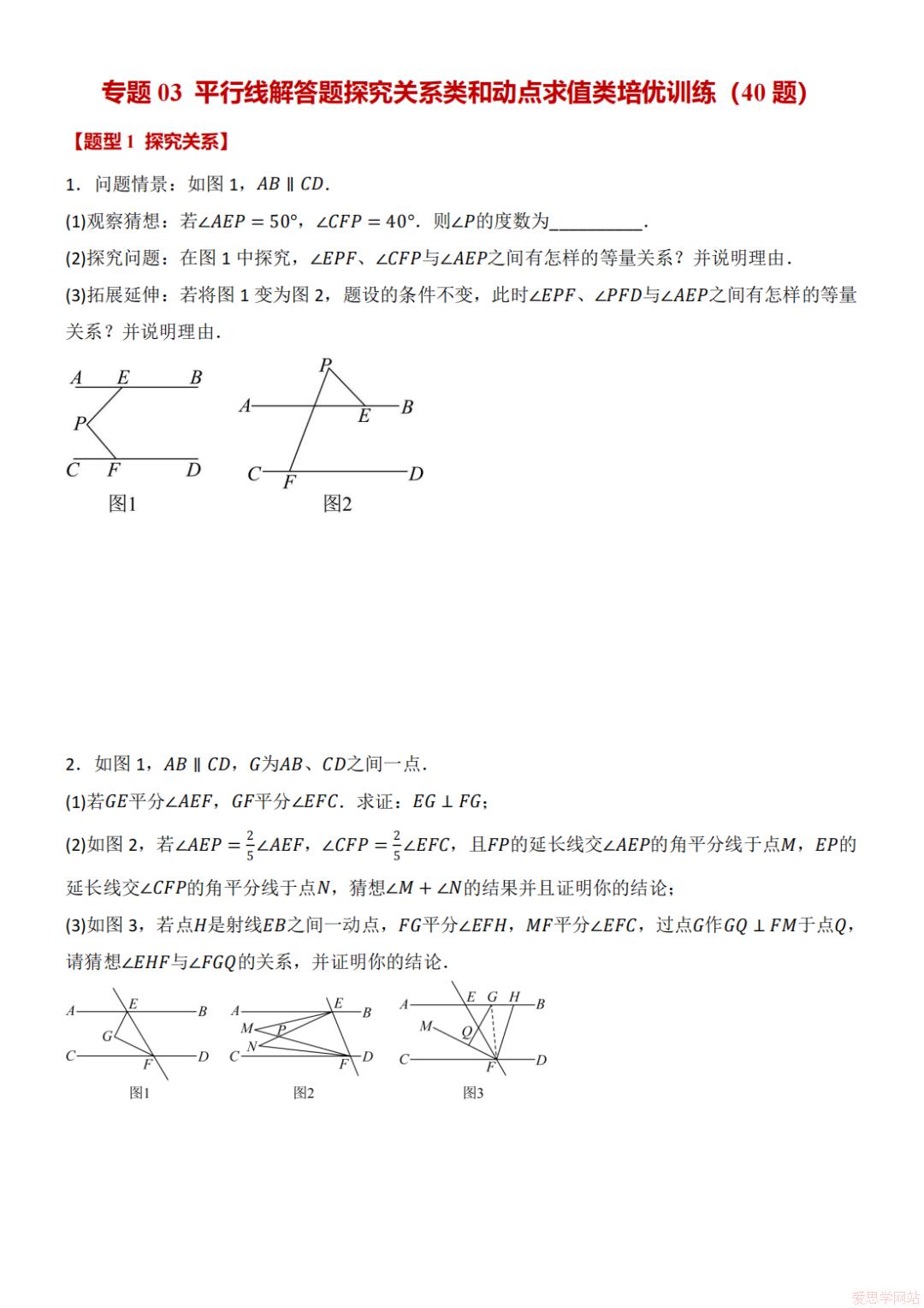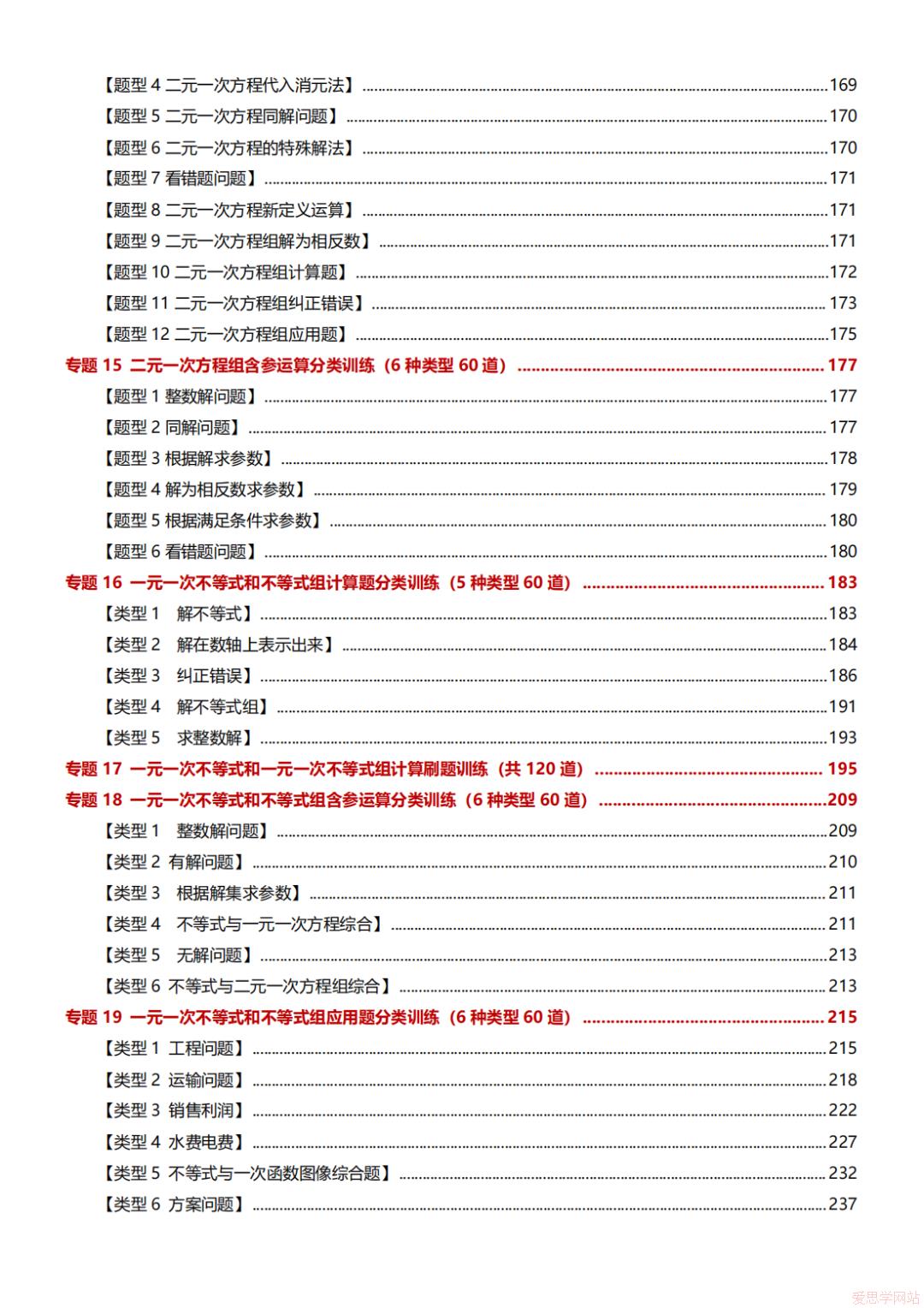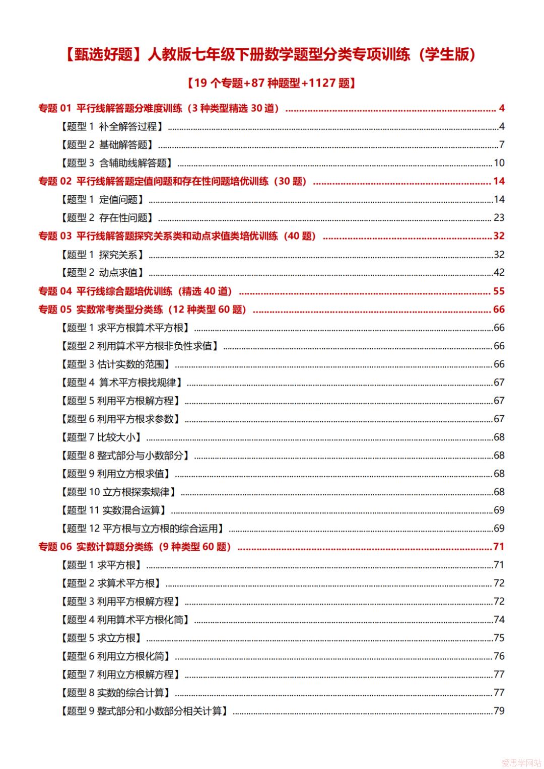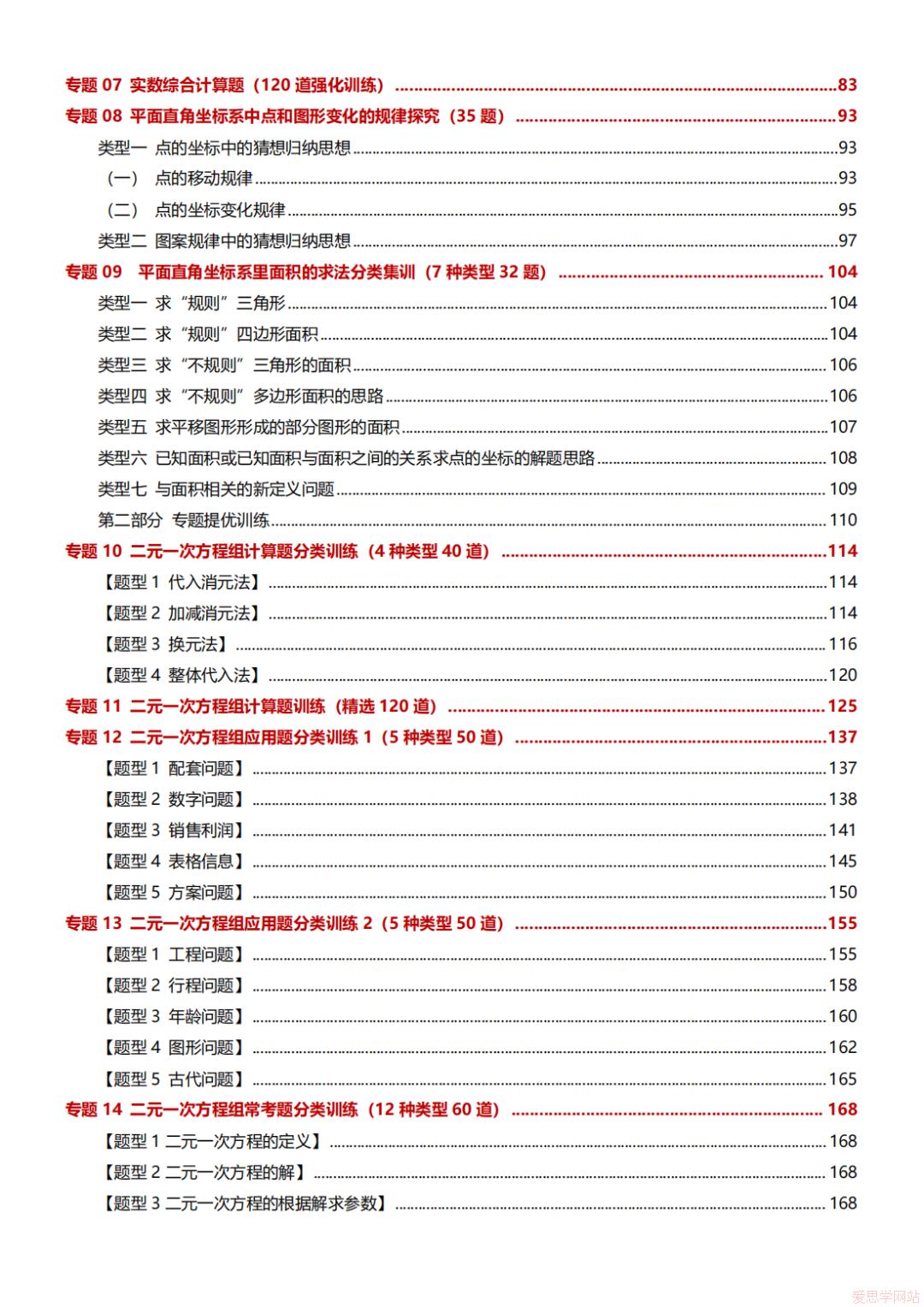 专题01 平行线解答题分难度训练(3种类型精选30道)专题02 平行线解答题定值问题和存在性问题培优训练(30题)专题03 平行线解答题探究关系类和动点求值类培优训练(40题)专题04 平行线综合题培优训练(精选40道)专题05 实数常考类型分类练(12种类型60题)专题06 实数计算题分类练(9种类型60题)专题07 实数综合计算题(120道强化训练)专题08 平面直角坐标系中点和图形变化的规律探究(35题)专题09 平面直角坐标系里面积的求法分类集训(7种类型32题)专题10 二元一次方程组计算题分类训练(4种类型40道)专题11 二元一次方程组计算题训练(精选120道)专题12 二元一次方程组应用题分类训练1(5种类型50道)专题13 二元一次方程组应用题分类训练2(5种类型50道)专题14 二元一次方程组常考题分类训练(12种类型60道)专题15 二元一次方程组含参运算分类训练(6种类型60道)专题16 一元一次不等式和不等式组计算题分类训练(5种类型60道)专题17 一元一次不等式和一元一次不等式组计算刷题训练(共120道)专题18 一元一次不等式和不等式组含参运算分类训练(6种类型60道)专题19 一元一次不等式和不等式组应用题分类训练(6种类型60道)