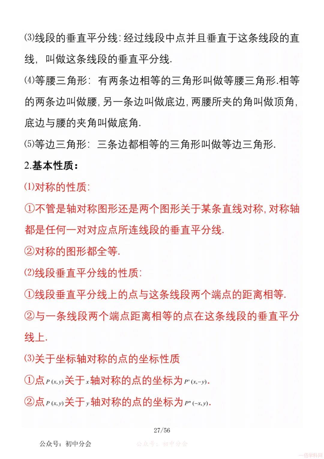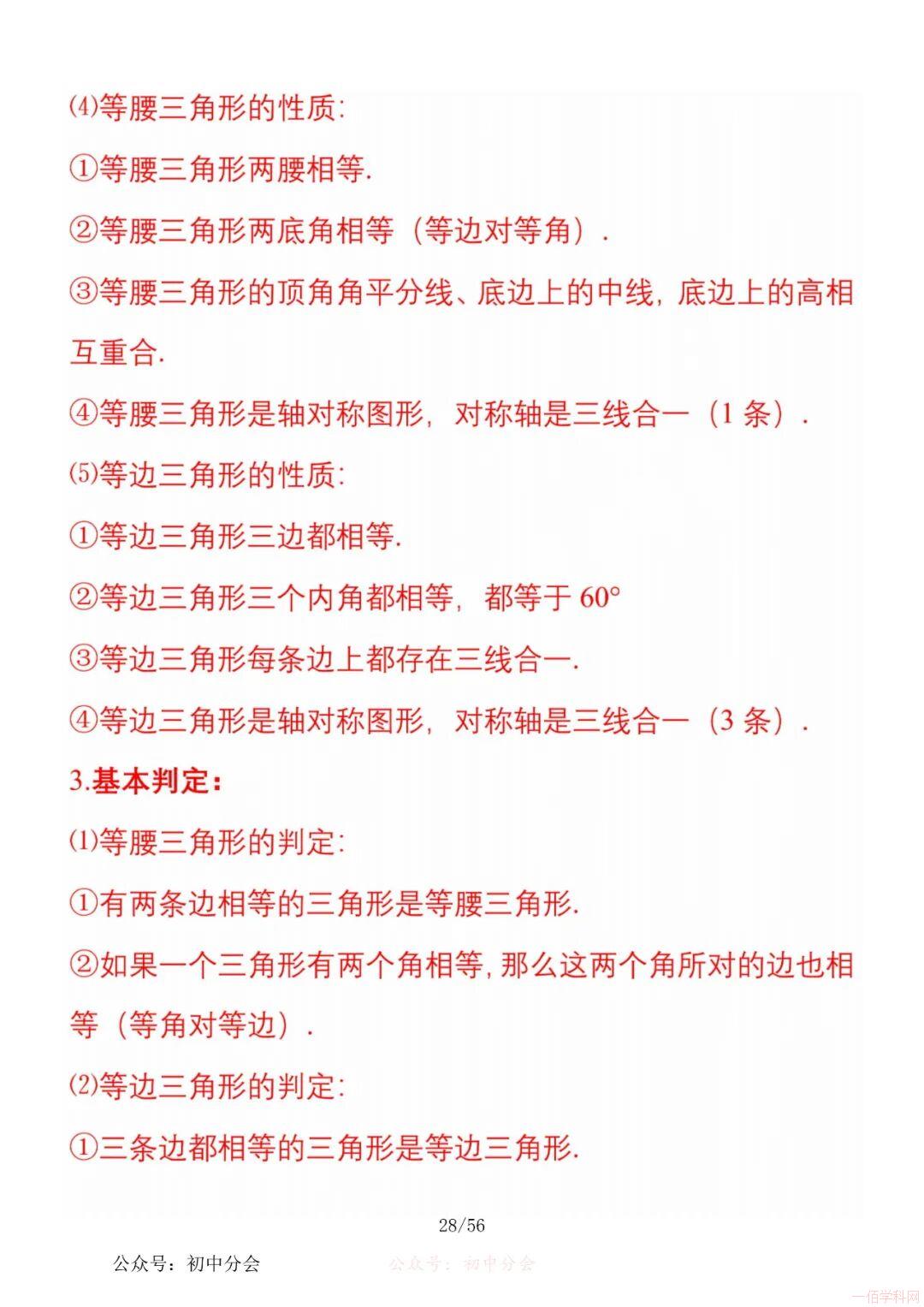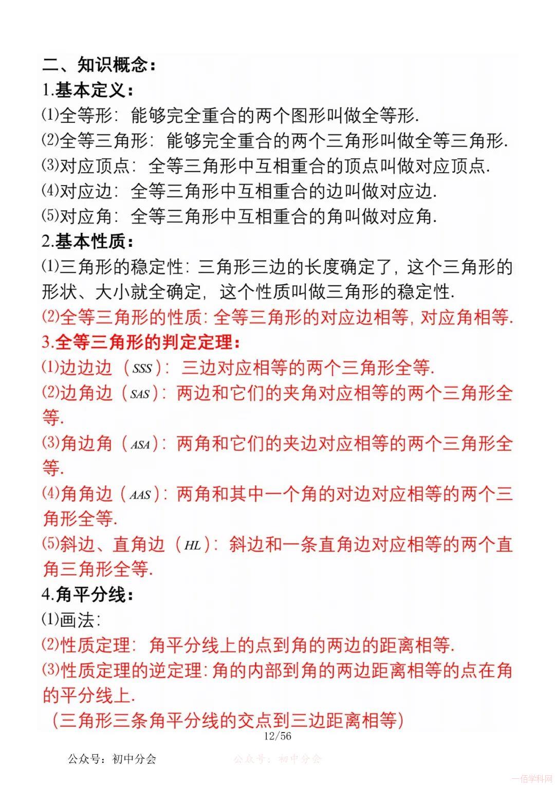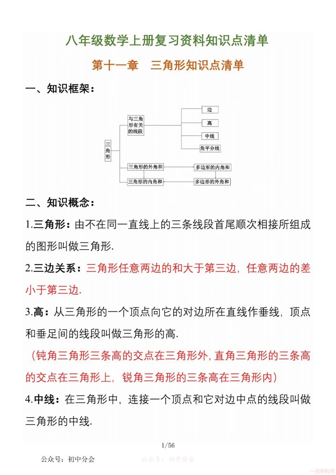 数学八年级上册分单元知识点总结,共56页,高清无水印,抓准考题及知识点背诵,师生复习参考使用!