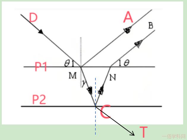情况2——斜射(以空气射入为例)(1)在表面发生反射,如下图的光线MA就是在P1表面形成的反射光线,CN是P2表面形成的反射光线(2)同时发生折射,下图的MC、NB、CT就是折射光线