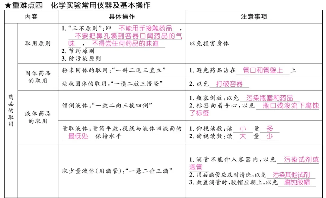 (6)取用仪器:药匙(粉末或小晶粒状)、镊子(块状或较大颗粒)、胶头滴管(少量液体)