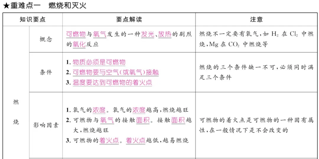 注意:燃烧的三个条件缺一不可;可燃物着火点是不可改变的。